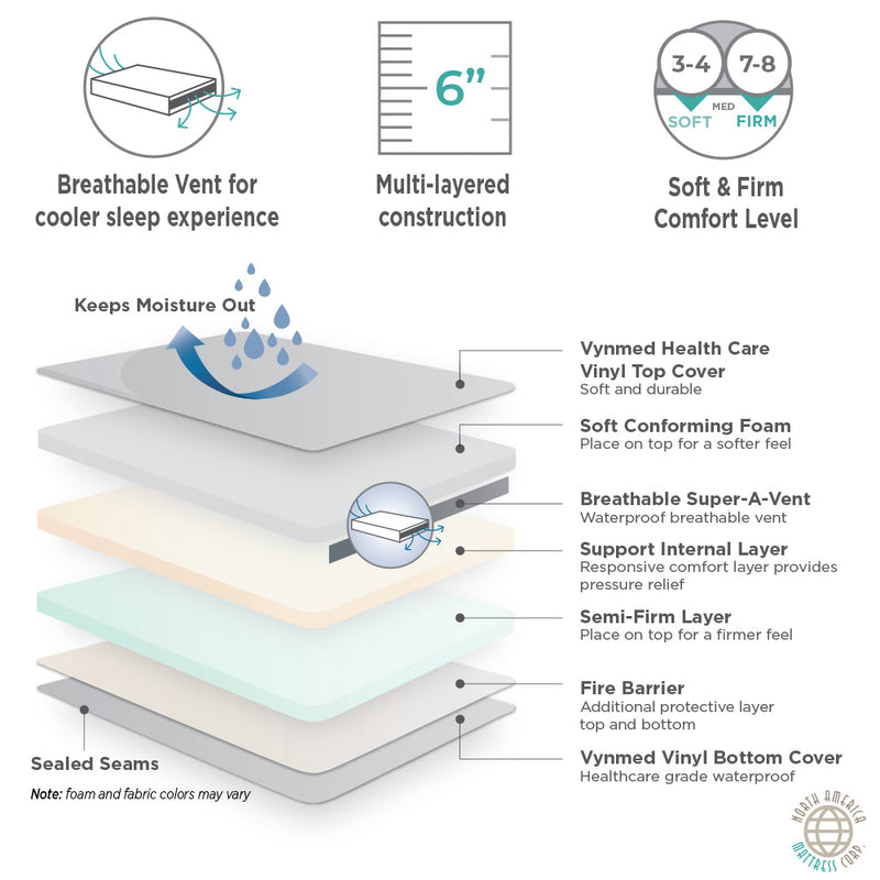 For added peace of mind, a protective fire-barrier layer is placed between the cover and foam to support required flammability standards for healthcare settings.