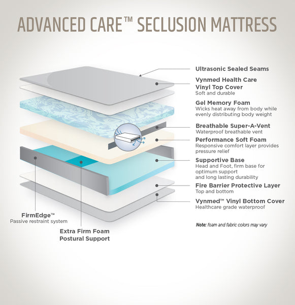 Our Secure Tuff mattress is a Nymed™ polyurethane coated healthcare nylon top, (210 denier; soft-never brittle) and a Vynmed™ Tuff healthcare polyurethane coated vinyl bottom. The fluid proof, anti-bacterial, anti-fungal, stain resistant cover protects the multi-layered, multi density convoluted foam core. With its High resiliency 1.8lb density 45ILD foam and FirmEdge™ passive restraint system you can be assured that comfort, durability and protection. All of our mattresses come with a 12 month standard Warranty and meet the CFR 1633 fire test requirements.