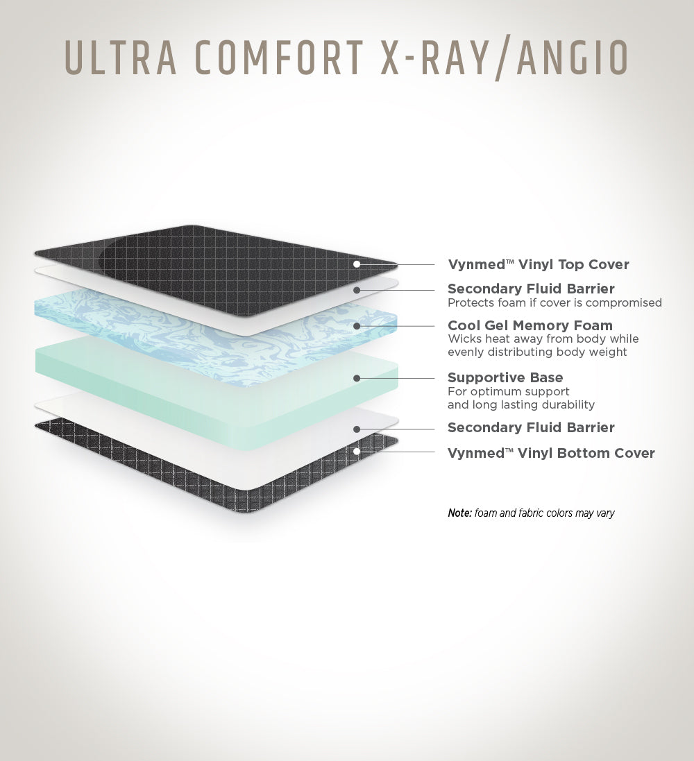The Ultra Comfort X-Ray/Angio Pads come with a Vynmed™ healthcare coated vinyl cover with sealed seams to provide protection from fluid penetration. The multi-layered, high resiliency, medical grade, CertiPUR-US certified urethane foam, including gel infused memory foam is designed for short stay procedural tables with added comfort, support and durability. All NAMC X-Ray and Angio Pads include a Secondary Fluid Barrier that is assembled between the foam and cover providing a unique protection; if the outer layer is compromised, the foam remains protected.