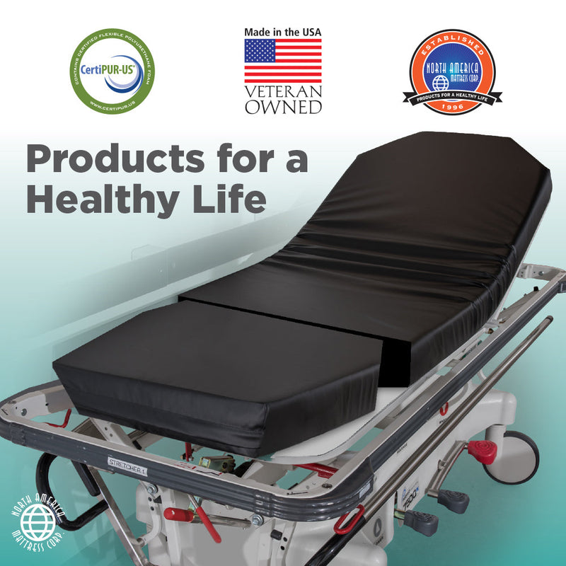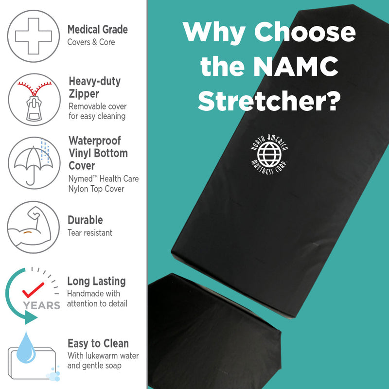 Our Standard Stretchers mattress has a replaceable, waterproof Vynmed™ healthcare coated vinyl cover and a heavy-duty zipper on bottom allows for internal mattress inspection and easy replacement. It also includes fluid protection flap over zipper which directs fluids over and away from the zipper area. The multi-layered, high resiliency, medical grade, CertiPUR-US certified urethane foam is designed for short stay procedural/transfers with added comfort, support and durability. All NAMC Stretchers include a Secondary Fluid Barrier that is assembled between the foam and cover providing a unique protection; if the outer layer is compromised, the foam remains protected.
