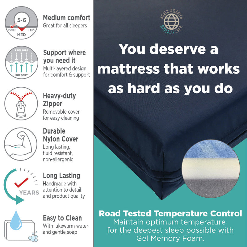 Created by America best truck mattress design team to incorporate the top quality Gel Infused Memory Foam with a soft foam internal layer, and a firm foam base that brings you both comfort and support in one superior truck mattress. (NOTE: foam and fabric colors may vary.)