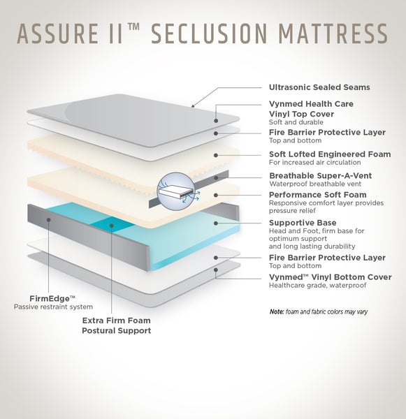 Our standard mattress features include a Vynmed™ healthcare vinyl permanent mattress cover accompanied with our Symmetrical foam layering head to foot. The FirmEdge™ passive restraint system is a 3 wide ultra-firm foam located on both sides for added protection. All of our mattresses come with a 12 month standard Warranty and meet the CFR 1633 fire test requirements..