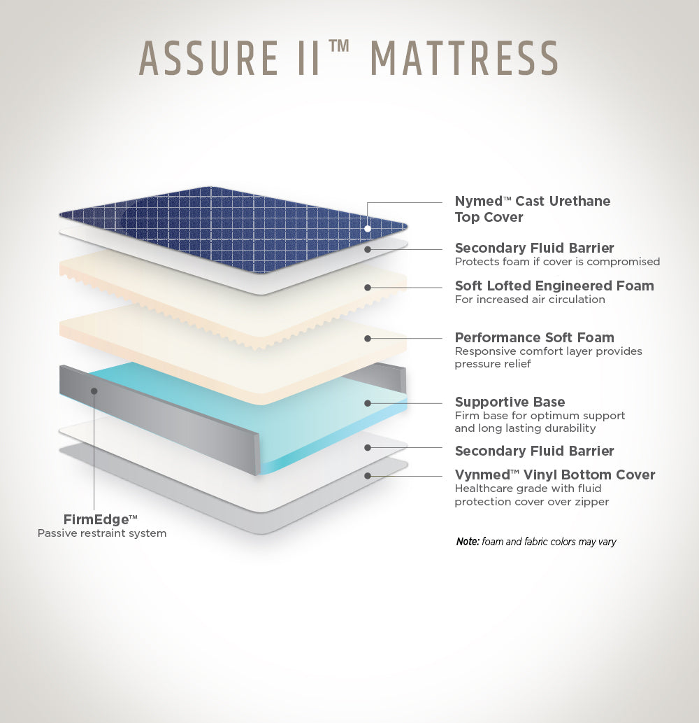 Our Assure II™ Med-Surg Mattress General Patient and ICU/CCU hospital bed mattresses are multi-layered, multi-density for optimal comfort and postural support. With a 1.8 density 45 ILD core and two 3 wide FirmEdge™ passive restraint system sides this mattress is perfect for those longer stays and high risk patients. These mattresses are made with a Nymed™ healthcare nylon removable top cover and a Vynmed™ healthcare vinyl removable bottom cover. All of our mattresses come with a 12 month standard Warranty and meets California Technical Bulletin 121 and 16CFR part 1633 fire test requirements.