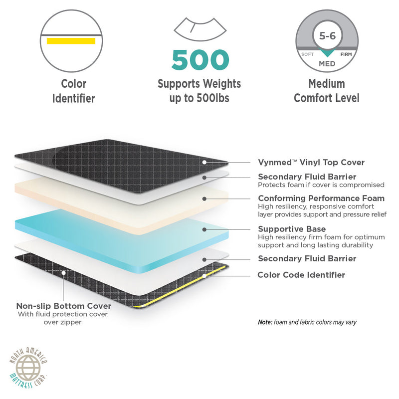 Durable, Breathable Vynmed™ Health Care Vinyl Top Cover Soft-supple feel offers exceptional comfort. This cover is anti-bacterial, anti-fungal, water resistant, stain resistant, antistatic, Non-allergenic, non-irritating, and is Latex Free.