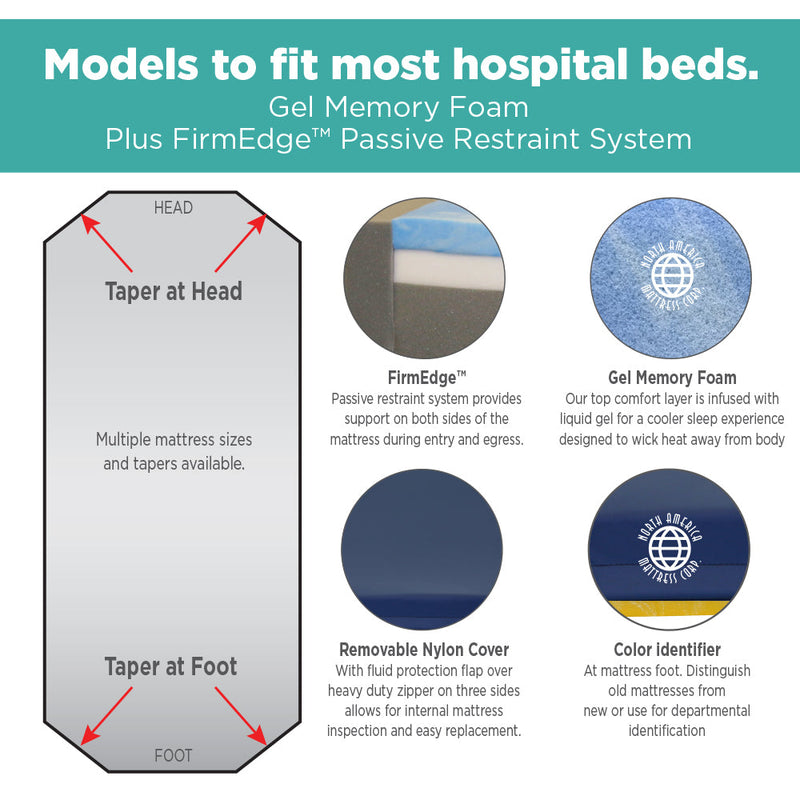 The Ultra Comfort Stretcher & Gurney mattresses come in a Nymed 6™ healthcare grade nylon top cover with a Vynmed™ healthcare coated vinyl bottom cover and a heavy-duty zipper on bottom allows for internal mattress inspection and easy replacement. It also includes fluid protection flap over zipper which directs fluids over and away from the zipper area. The multi-layered, high resiliency, medical grade, CertiPUR-US certified urethane foam, including gel infused memory foam is designed for short stay procedural/transfers with added comfort, support and durability. Plus, the FirmEdge™ Passive Restraint System provides support on both sides of the mattress during entry and departure.