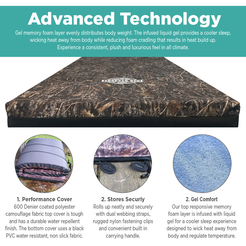 The Trapper Bed 4" Luxury Gel Memory Foam Hunter Camping Sleep Pad series features four different sizes to fit any preference. The four inch thick, multi-layered pad can be rolled up for storage, while open-cell polyurethane foam maintains shape and cushion.