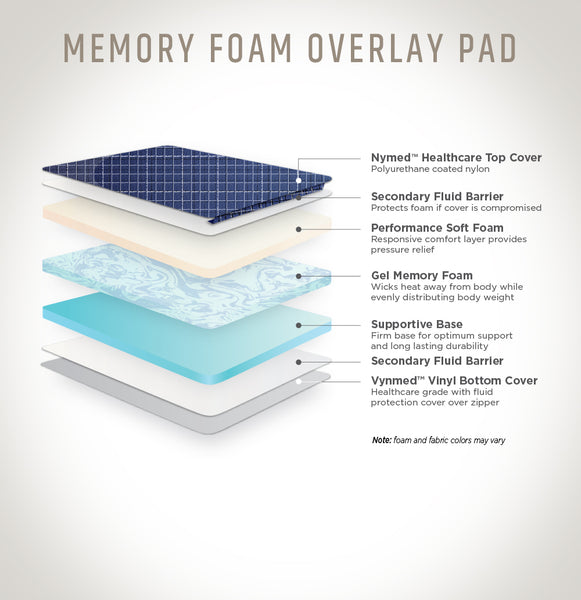 Our Ultra Comfort Overlay Pads with memory foam are designed to attach securely over an existing mattress assuring outstanding comfort and durability with no slipping or shifting. With a Nymed™ healthcare nylon top and a Vynmed™ healthcare polyurethane coated vinyl bottom assures that durable anti-static, stain resistant, non-allergenic mattress cover. The gel infused memory foam conforms to the body’s exact shape and position, distributing weight and reducing stress on pressure points while returning to its original shape for the next patient.